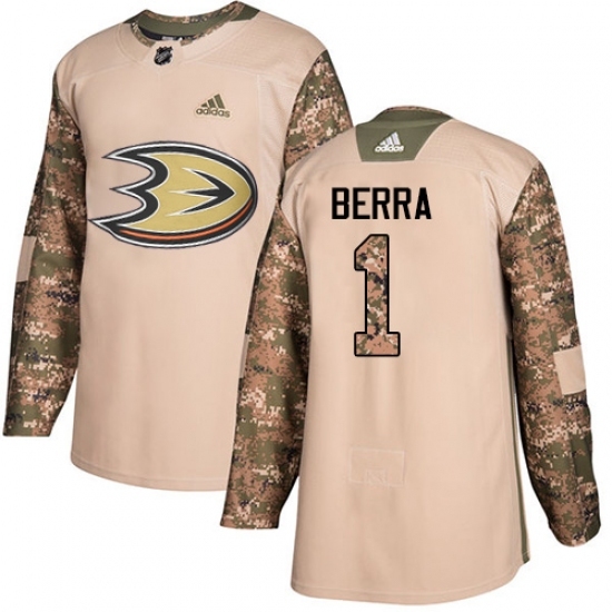 • Men's Adidas Anaheim Ducks #1 Reto Berra Authentic Camo Veterans Day Practice NHL Jersey