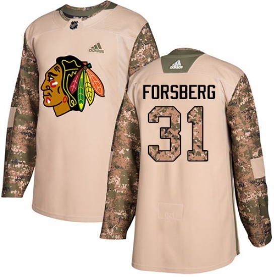 • Men's Adidas Chicago Blackhawks #31 Anton Forsberg Authentic Camo Veterans Day Practice NHL Jersey