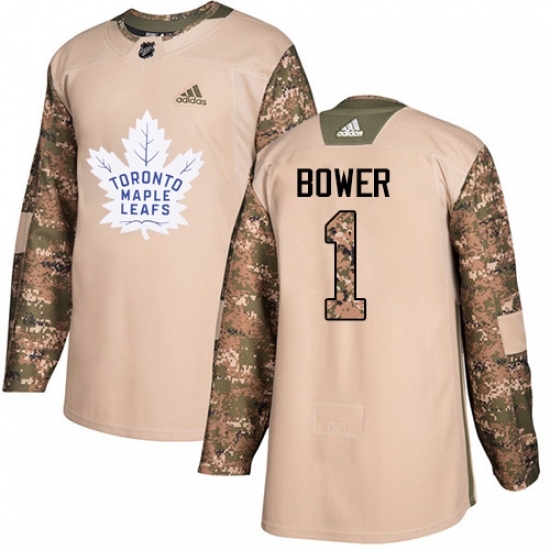 • Men's Adidas Toronto Maple Leafs #1 Johnny Bower Authentic Camo Veterans Day Practice NHL Jersey