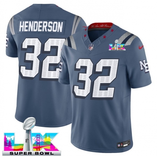New England Patriots 32 TreVeyon Henderson Storm Blue 2025 F U S E Super Bowl LX Patch Rivalries Vapor Limited Stitched Football Jersey