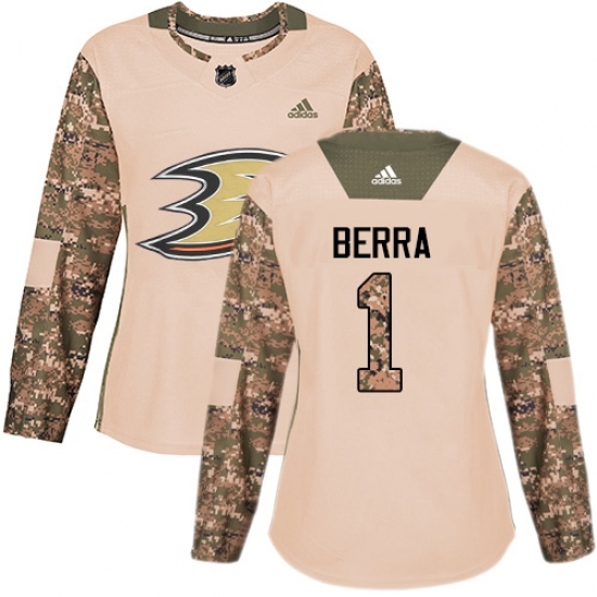 • Women's Adidas Anaheim Ducks #1 Reto Berra Authentic Camo Veterans Day Practice NHL Jersey
