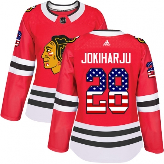 • Women's Adidas Chicago Blackhawks #28 Henri Jokiharju Authentic Red USA Flag Fashion NHL Jersey