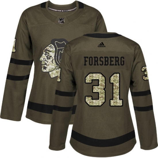 • Women's Adidas Chicago Blackhawks #31 Anton Forsberg Authentic Green Salute to Service NHL Jersey
