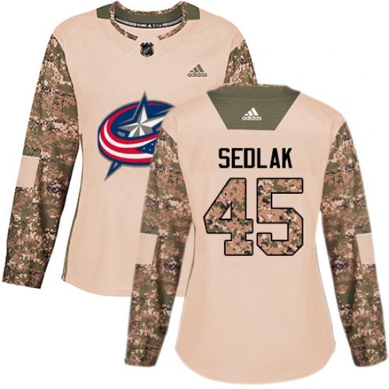 Women's Adidas Columbus Blue Jackets #45 Lukas Sedlak Authentic Camo Veterans Day Practice NHL Jersey