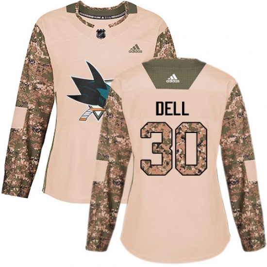 • Women's Adidas San Jose Sharks #30 Aaron Dell Authentic Camo Veterans Day Practice NHL Jersey