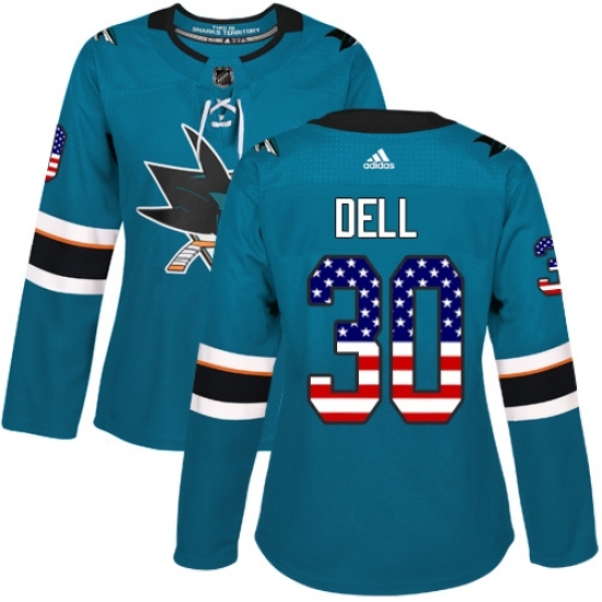 • Women's Adidas San Jose Sharks #30 Aaron Dell Authentic Teal Green USA Flag Fashion NHL Jersey