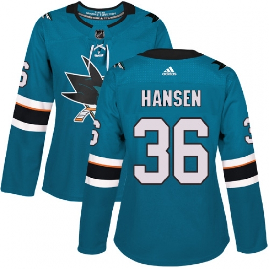 • Women's Adidas San Jose Sharks #36 Jannik Hansen Authentic Teal Green Home NHL Jersey