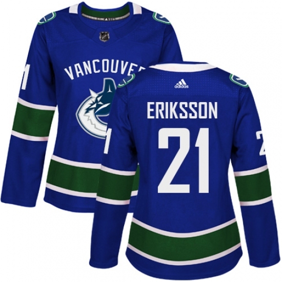 Women's Adidas Vancouver Canucks #21 Loui Eriksson Authentic Blue Home NHL Jersey