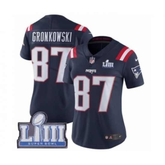 • Women's Nike New England Patriots #87 Rob Gronkowski Limited Navy Blue Rush Vapor Untouchable Super Bowl LIII Bound NFL Jersey