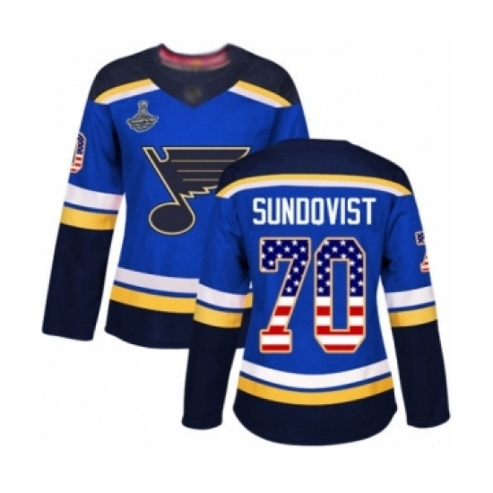 Women's St. Louis Blues #70 Oskar Sundqvist Authentic Blue USA Flag Fashion 2019 Stanley Cup Champions Hockey Jersey