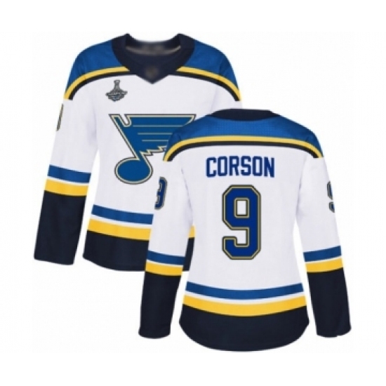 Women's St. Louis Blues #9 Shayne Corson Authentic White Away 2019 Stanley Cup Champions Hockey Jersey