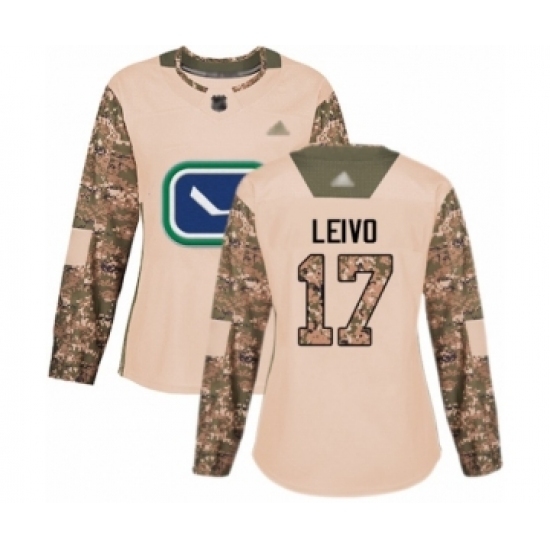 • Women's Vancouver Canucks #17 Josh Leivo Authentic Camo Veterans Day Practice Hockey Jersey