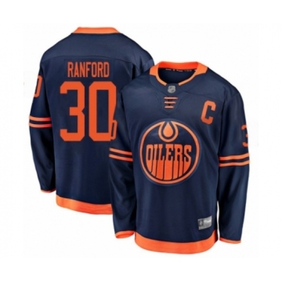 • Youth Edmonton Oilers #30 Bill Ranford Authentic Navy Blue Alternate Fanatics Branded Breakaway Hockey Jersey